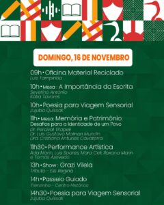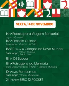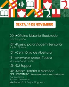 O evento também reunirá livrarias e editoras, além de uma praça gastronômica e de um Café Literário, espaço ideal para boas conversas e descobertas literárias.