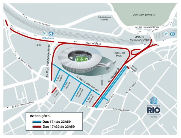 A CET-Rio montou esquema de trânsito para o clássico entre Vasco e Fluminense, nesta quinta-feira (11/12), às 20h, no Maracanã, pela semifinal da Copa do Brasil. As interdições ao tráfego de veículos na região começam a partir das 17h e vão até as 23h59. Além dos locais regulamentados com proibição de estacionamento, outras vias também estarão restritas ao estacionamento a partir das 10h.